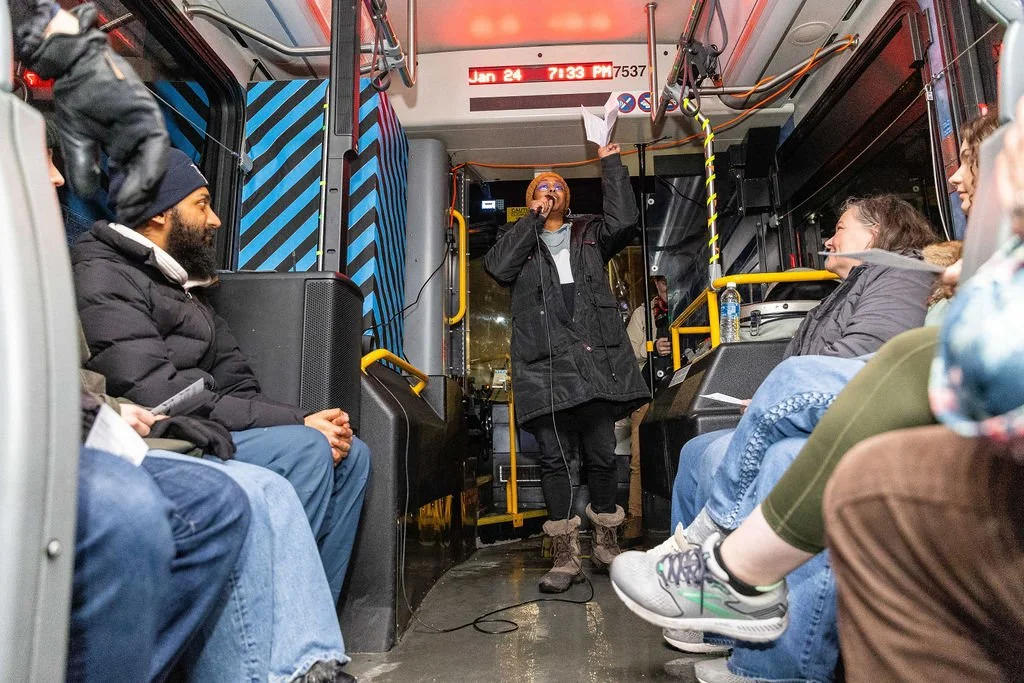 I reinvented Rapid Art Movement, originally held in 2020, to integrate visual and performing arts into a public transit setting. For the event, passengers boarded a DASH bus transformed through drawings, sculpture, poetry, and performance and took a one-hour ride through downtown Grand Rapids, MI as part of its World of Winter festival. The artists were prompted to make work that reflected how our lives are shaped by winter, and the bus ride was divided into four phases: the first snowfall, freeze, storm, and melt.